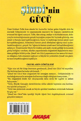 Üstat Eckhart Tolle kısa sürede bir bestseller haline gelen bilgelik dolu bu eserinde bilincimizde ve yaşamımızda mucizevi bir değişim yaratabilecek evrensel bir öğreti sunuyor. Tolle, tüm ıstırap, endişe ve korkularımızın, dolayısıyla mutsuzluğumuzun gerçek kaynağını çarpıcı bir biçimde gösterip, onu şimdi ve burada nasıl aşabileceğimizi, huzur ve mutluluğa hemen şimdi nasıl kavuşabileceğimizi, bilincimizi hemen şimdi dönüşüme uğratıp nasıl aydınlanabileceğimizi, gerçek Var’lığımızla hemen şimdi nasıl birleşebileceğimizi anlatıyor. Eleştirmenler böyle bir kitabın çok nadir olarak geldiği konusunda görüş birliğine varırken, okurlar yaşamlarında olağanüstü değişimlerin meydana geldiğini bildiriyorlar. Şimdi’nin Gücü yaşamımızın her anının bir mucize olduğunu fark etmemizi sağlıyor ve büyük bir yetkinlikle Şimdi’nin gücüne nasıl erişebileceğimizi açıklıyor.